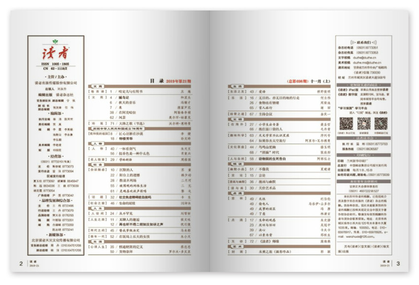 《讀者》是由讀者雜志社出版。創(chuàng)刊于1981年,發(fā)行周期為半月刊,雜志類別為文學(xué)文摘類,全年訂價(jià)59.00元。
