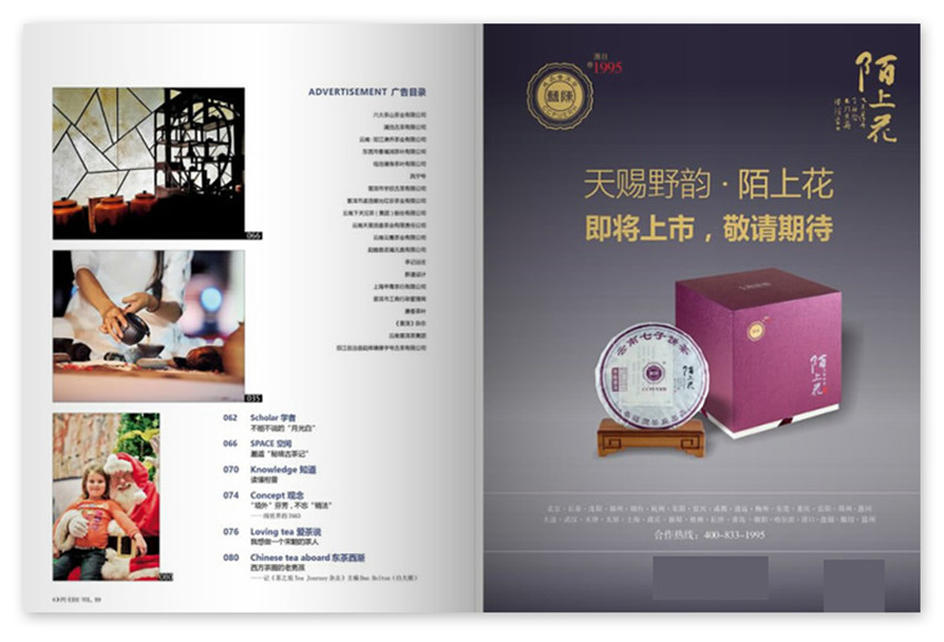 《普洱》給讀者帶來全新的閱讀體驗,無論發(fā)行量還是影響力,均在家庭生活雜志中位居前列。以“健康”、“文化”、“財富”的辦刊理念,以服務(wù)普洱茶產(chǎn)業(yè),挖掘、推介、弘揚普洱茶文化為宗旨,引領(lǐng)普洱茶消費,倡導(dǎo)一種普洱茶的健康生活方式,詮釋“農(nóng)業(yè)普洱”、“文化普洱”、“科學(xué)普洱”、“人文普洱”的深邃內(nèi)涵及嬗變歷程。