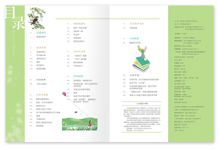 《小讀者》是由中國(guó)報(bào)道雜志社出版。創(chuàng)刊于2002年,發(fā)行周期為月刊,雜志類別為少兒閱讀類,全年訂價(jià)128.60元。