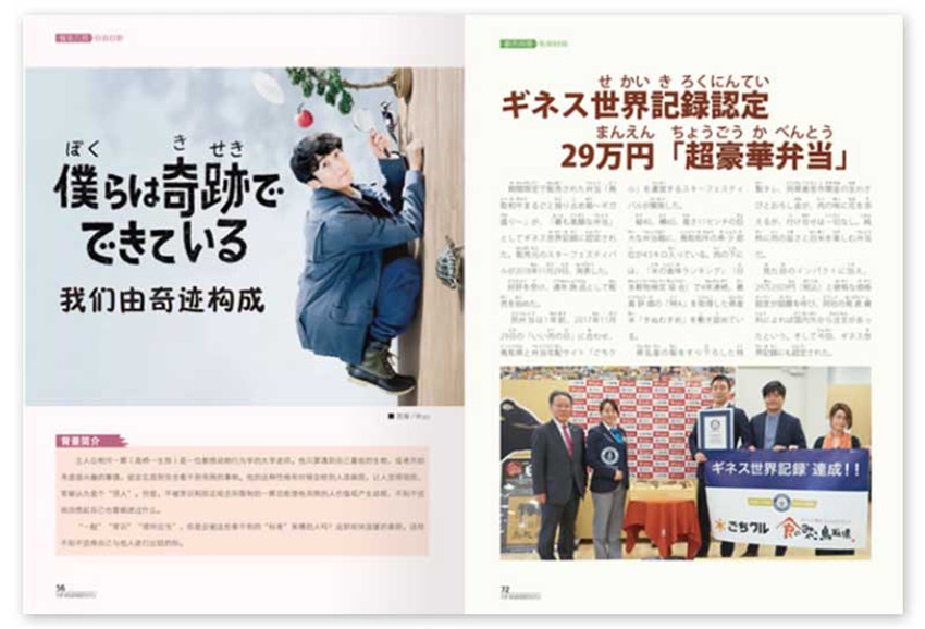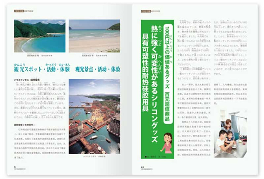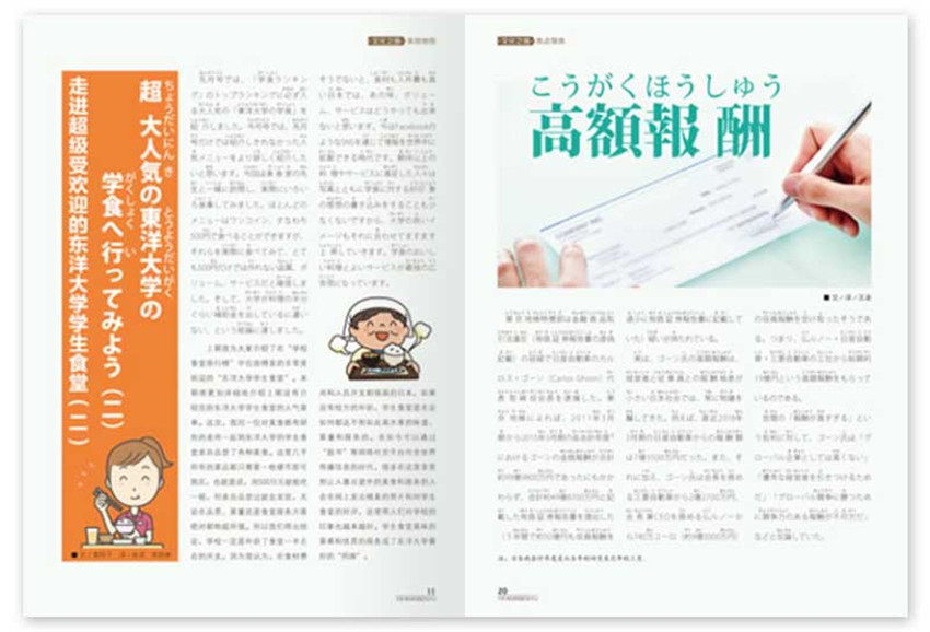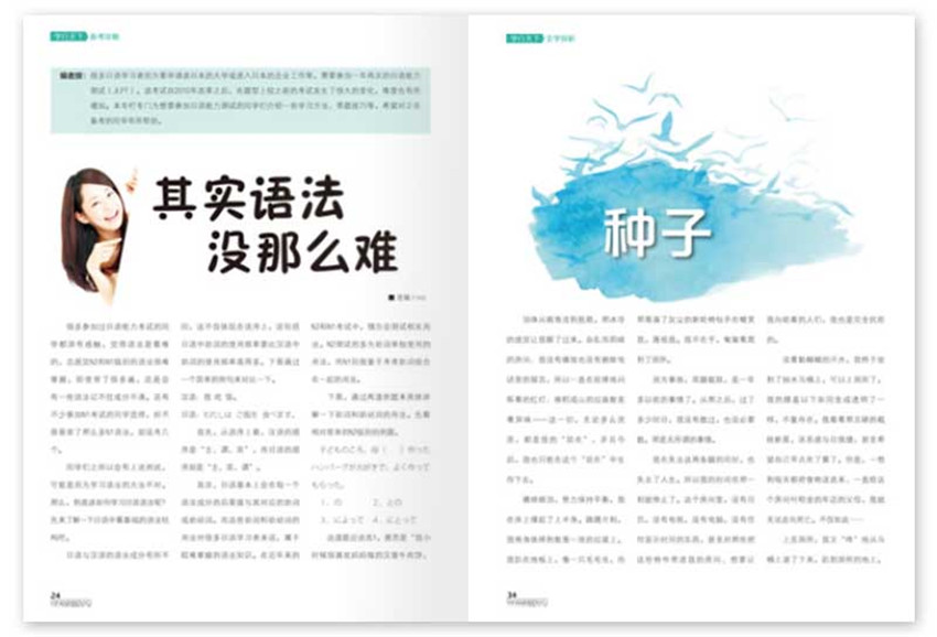 這里是學(xué)習(xí)日語(yǔ)知識(shí)的欄目,在休閑閱讀的同時(shí)輕松學(xué)習(xí)日語(yǔ),文化之旅,日本傳統(tǒng)文化與社會(huì)熱點(diǎn)相結(jié)合。獲得日本“東京流行通訊”的獨(dú)家版權(quán),在雜志上及時(shí)時(shí)間日本新、快的社會(huì)各類資訊,獲得中國(guó)的官方機(jī)構(gòu)“中國(guó)日語(yǔ)教學(xué)研究會(huì)”全力支持,組織全國(guó)的日語(yǔ)專家和教授給讀者的日語(yǔ)學(xué)習(xí)和能力考試等提供的指導(dǎo)和幫助。