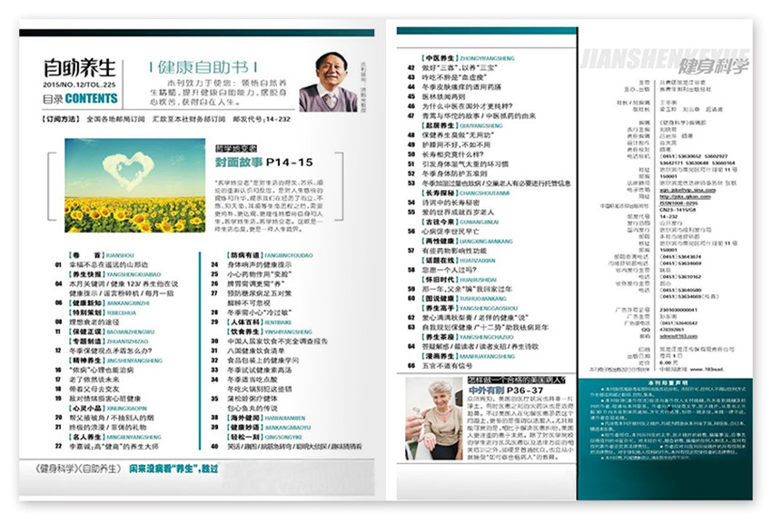關(guān)注心靈開解,重視身體修煉,提倡行為健康;力邀專家主持專欄,名仕奉獻經(jīng)典,吸納古今,取法中外,觀念領(lǐng)先,知識系統(tǒng),著名健康教育家洪昭光教授領(lǐng)銜健康顧問,每期超值饋贈精制別冊。以40-60歲的中老年人為主要讀者群體,定位于有一定經(jīng)濟條件同時關(guān)注養(yǎng)生、有精力有時間有能力的中老年人,除了傳達“以養(yǎng)防病、以養(yǎng)祛病”的理念外,還會是一本關(guān)注中老年人及家庭成員身心健康的養(yǎng)生期刊。